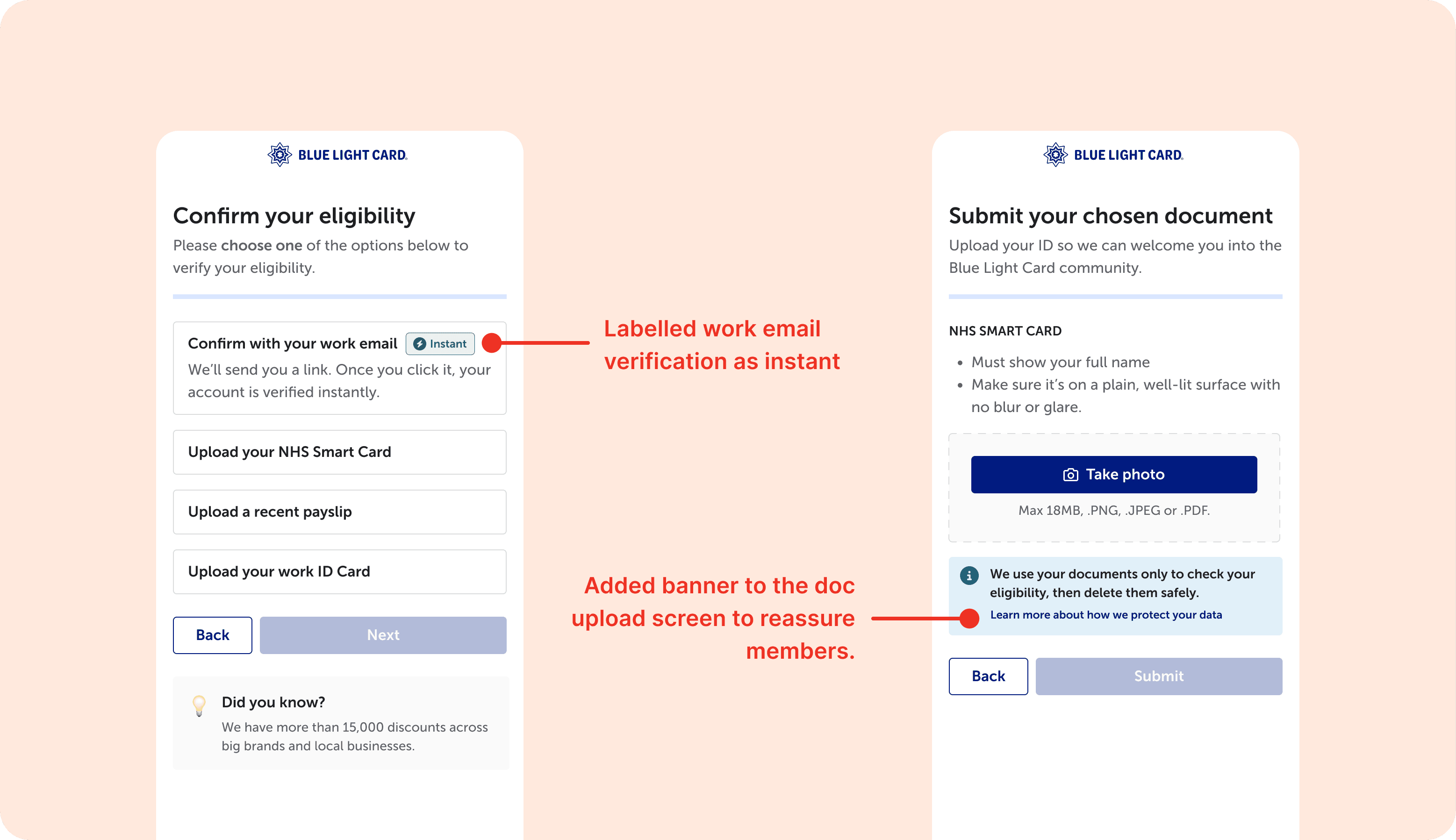 Solution: Privacy reassurance at document upload. Added messaging to reassure members about how their documents are used, addressing concerns about intrusiveness and privacy. Labelled work email as instant, encouraging users to use it when possible.
