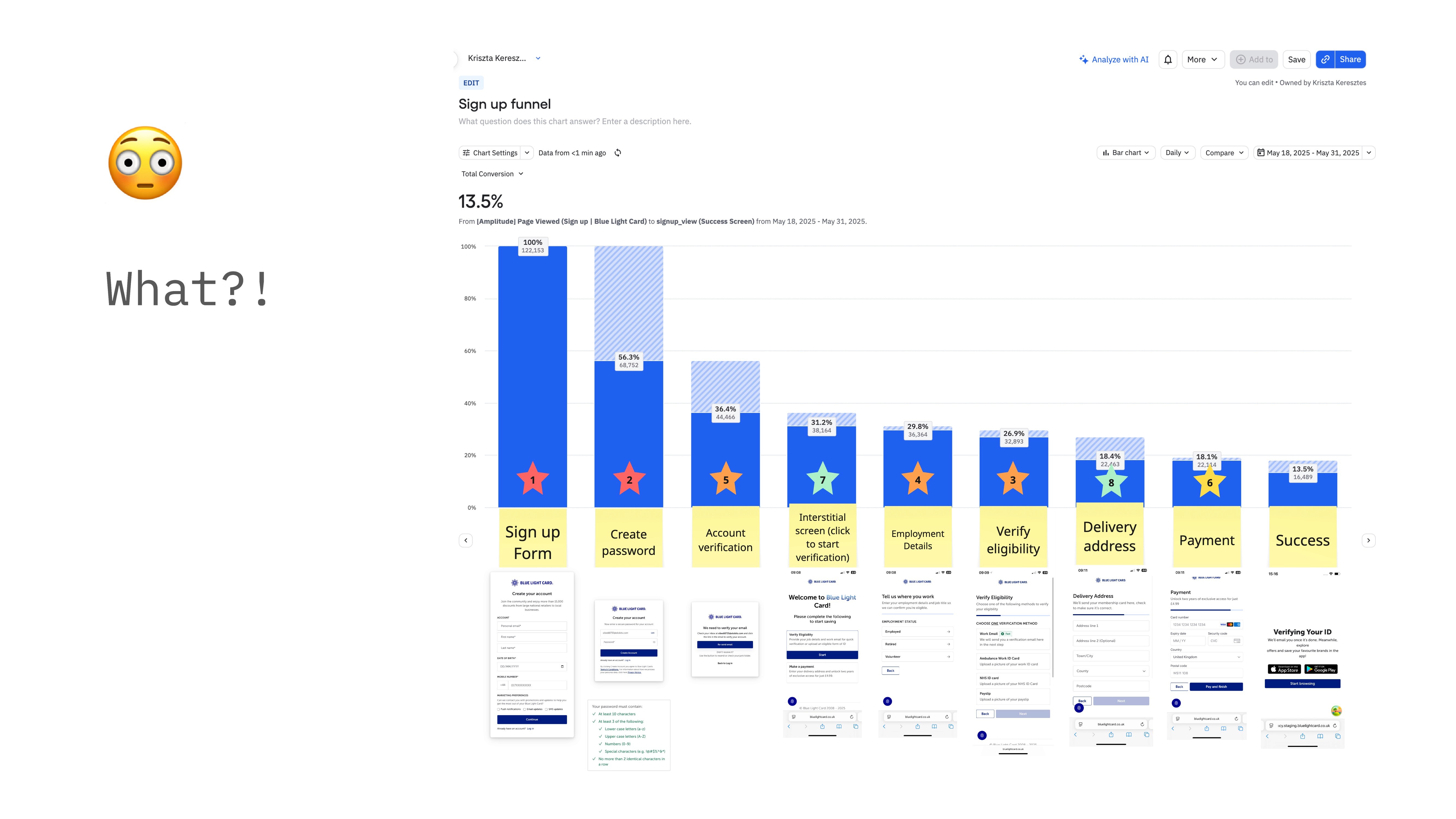 The biggest genuine drop-off occurred at eligibility verification, where users were asked to prove their status.
