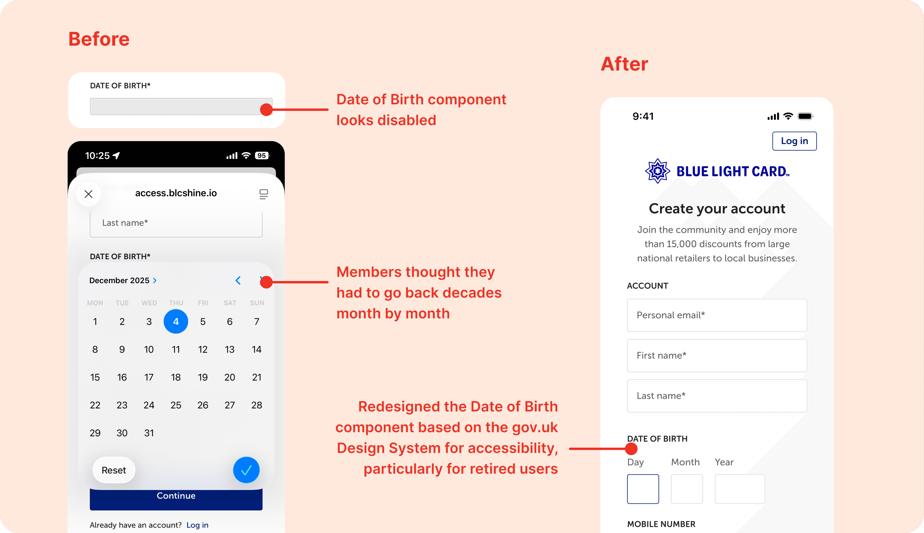 Solution: Redesigned the date of birth component using the gov.uk design system, improving accessibility and making year selection faster and more intuitive, especially for older users.