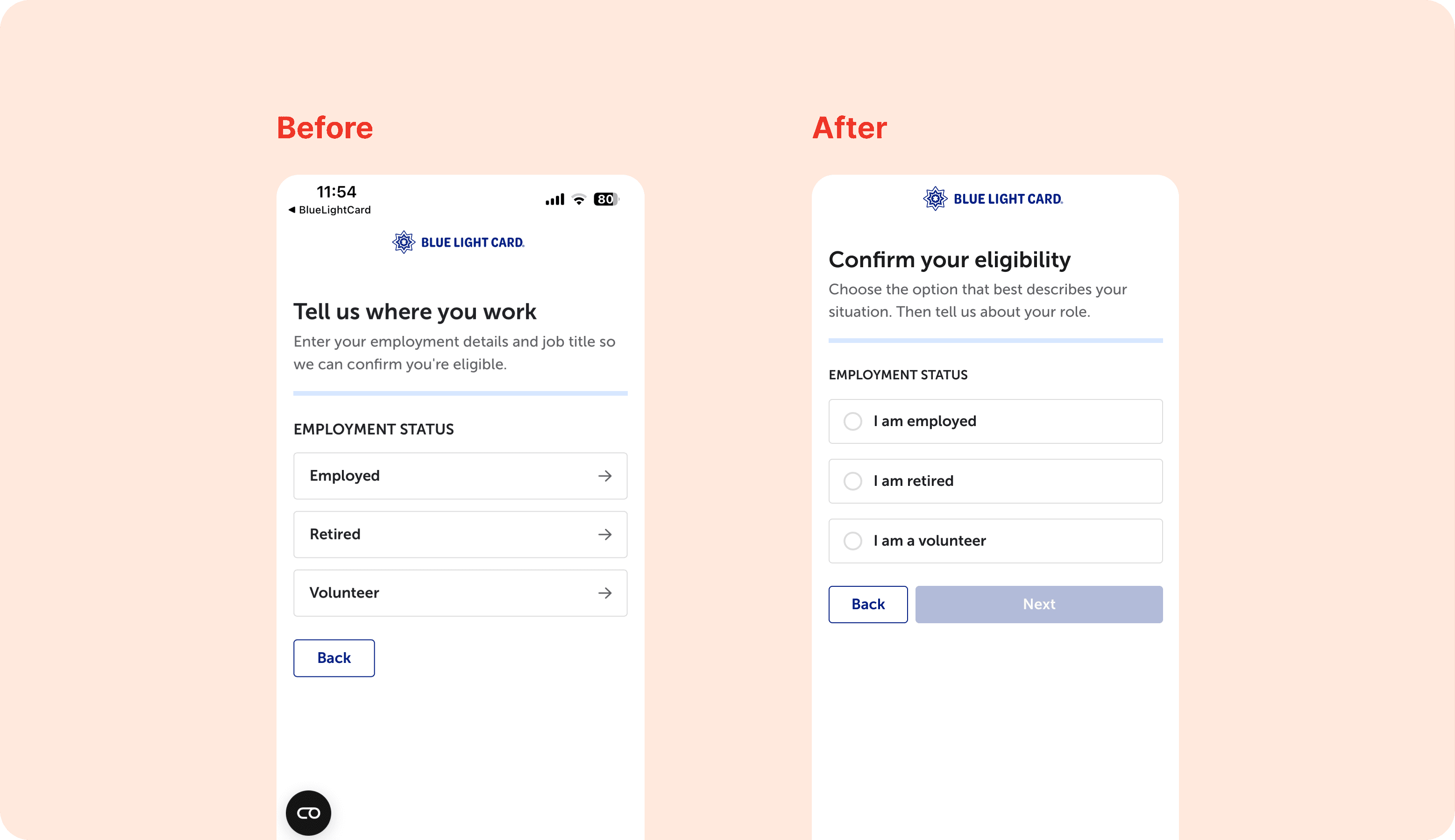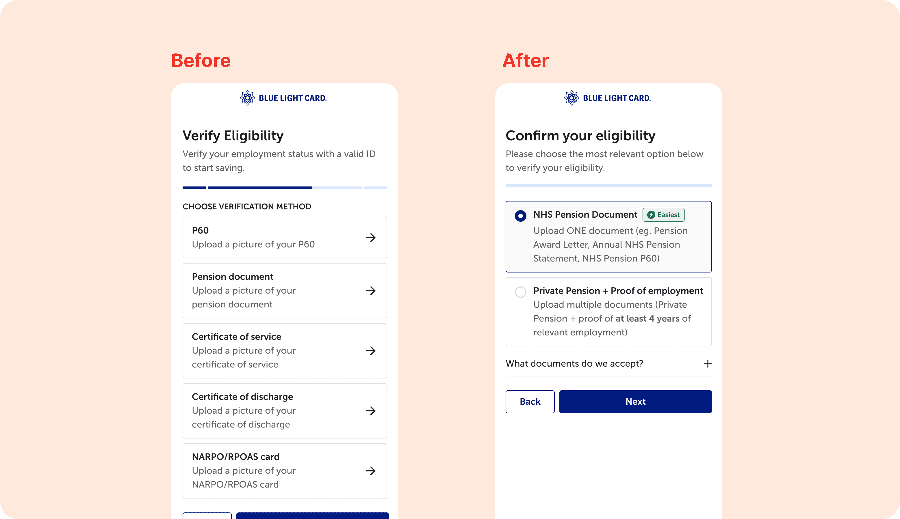While not all of this work has shipped, one key change was implemented in the retired member journey by consolidating eligibility verification options. This resulted in a conversion increase from ~49% to ~52%, outperforming both the pre-change flow and the typical non-retired funnel (~46%), validating the decision to reduce choice overload.